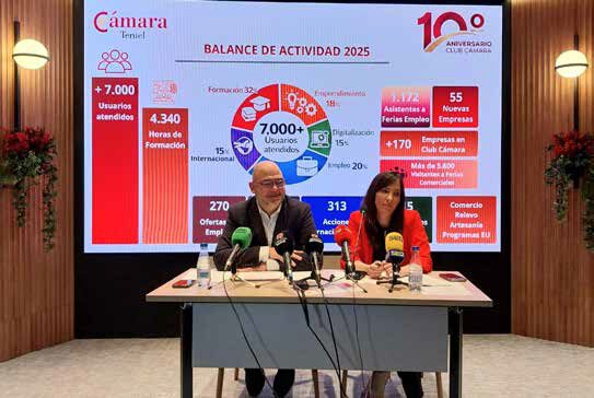 La Cámara de Comercio de Teruel ha presentado su balance de actividad correspondiente al ejercicio 2025. Los responsables lo han definido como “un año de intensa labor al servicio del tejido empresarial turolense”, con más de 7.000 usuarios atendidos. Entre los logros más destacados del año, la Cámara ha sido clave en la creación de 55 nuevas empresas a través del programa ARIES, que generaron 92 empleos y movilizaron una inversión superior a los 4,3 millones de euros. Además, se realizaron más de 390 consultas personalizadas sobre digitalización y se impartieron 4.340 horas de formación en diversos programas.