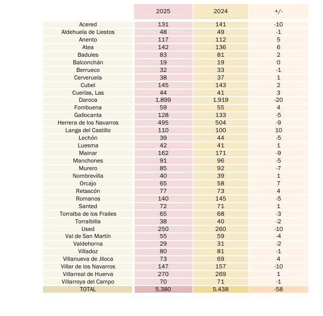 La población de la comarca Campo de Daroca ha vuelto a descender, aunque de forma más moderada que en el ejercicio anterior. Según los datos oficiales del Padrón Municipal a 1 de enero de 2025, el territorio comarcal suma un total de 5.380 habitantes, lo que supone 58 personas menos que las registradas un año antes, cuando la cifra alcanzaba los 5.438 vecinos.