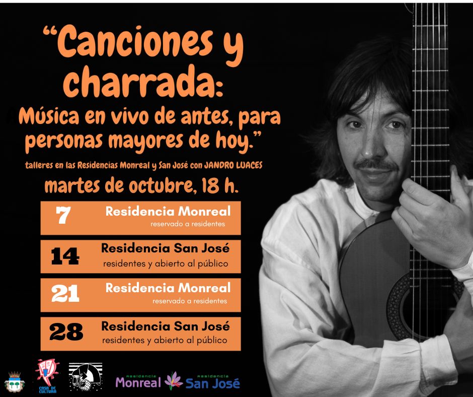 Bajo el título ‘Canciones y charrada: música en vivo de antes, para personas mayores de hoy’, se han organizado talleres en las Residencias Monreal y San José con Alejandro Luaces, a las 18 horas.
