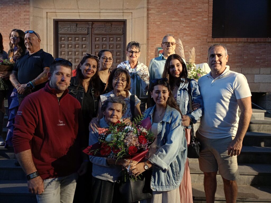 “Su juventud no fue fácil. La vida le exigió trabajar duro para seguir adelante, pero con esfuerzo supo abrirse camino”, fueron las palabras con las que Carmen Tortajada presentó a Vicenta Yuste Latorre quien, con 97 años, subió al escenario junto a sus familiares y el alcalde Mario Latorre para recoger un ramo y un título en su homenaje.