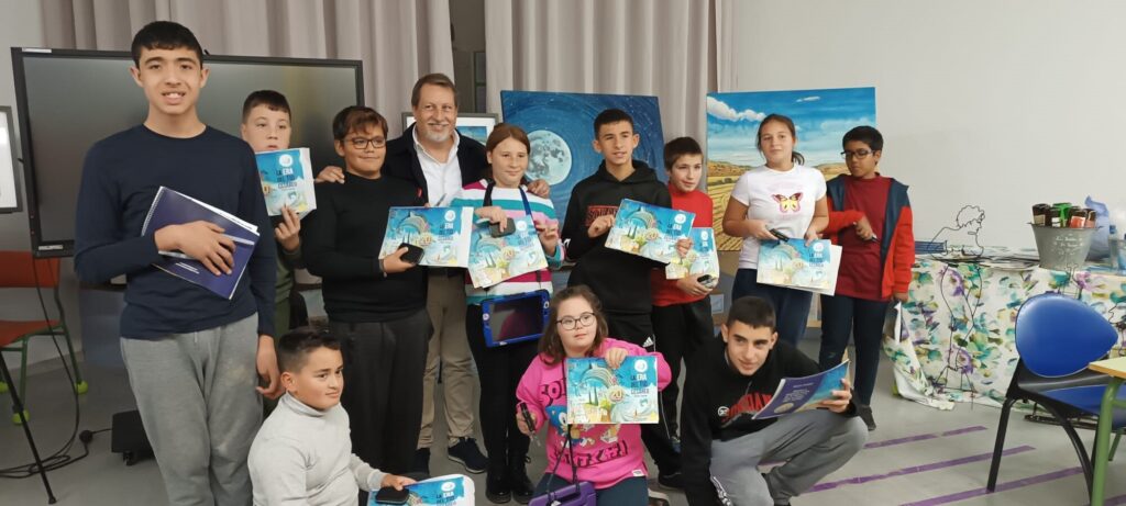 La actividad comenzaba con la narración del cuento “La Era del Tío Cesáreo”, una historia que habla de raíces, de respeto y de la belleza que nace en lo cotidiano. Después, cada alumno recibía un cuadernillo con acuarelas y pinceles de agua: una invitación a expresarse a través del color, a disfrutar del arte como un lenguaje universal.